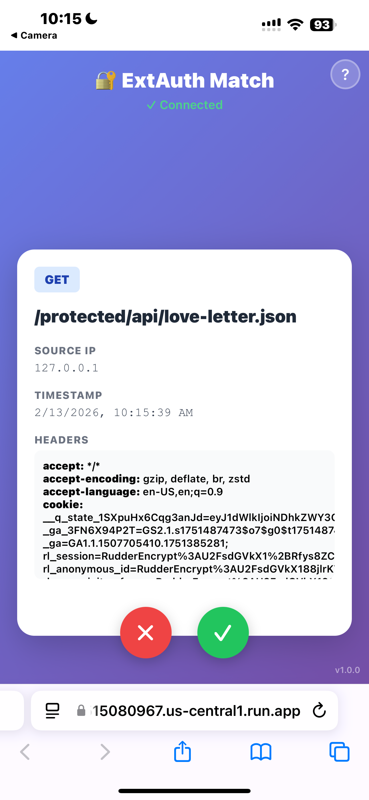 • Visit/refresh the match app from your browser following the instruction to trigger a request to agentgateway. Swipe the cards left or right on your phone to approve or deny.